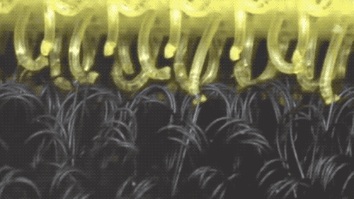 魔術貼通常由尼龍制成,在第一次人工心臟移植手術中,它甚至幫助將人類心臟固定在一起。它的粘性來自它的結構,魔術貼分公母兩面,一面是細小柔軟的纖維,名叫圓毛,另一面則是較硬、帶鉤的彈性纖維。記者通過顯微鏡觀察魔術貼的兩條帶子,發現一條帶子包含微小的環,而另一條帶子有微小的鉤子,可以抓住環并牢牢地固定。
